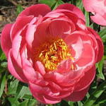 PINK HAWAIIAN CORAL - Large, cup shaped double coral, a more intensely bright shade that the other corals; cream carpels and yellow stamens peek through the center. |